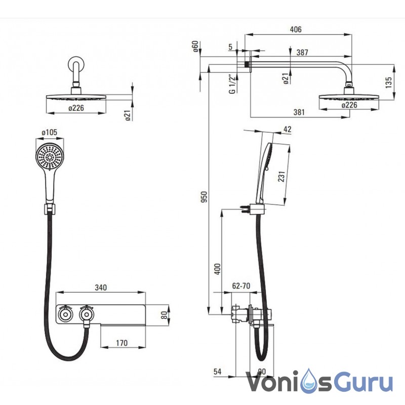 - Jame yra lietaus dušo galvutė, kurios skersmuo yra maždaug 226 mm.
