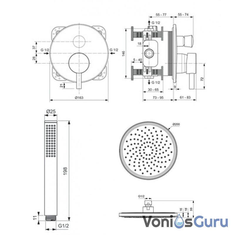 Potinkinė dalis, 200 mm galva, rankinis dušas "stick", 1/2 alkūnė su likikliu, 400 mm sieninė alkūnė, chromas