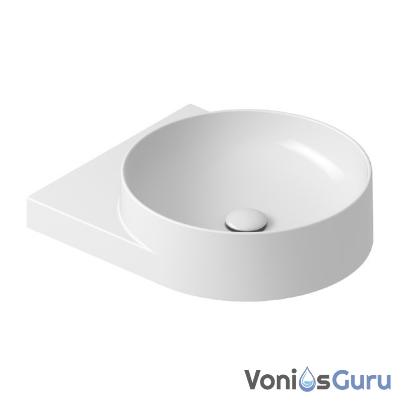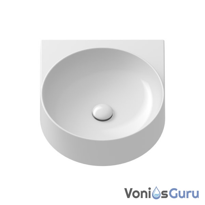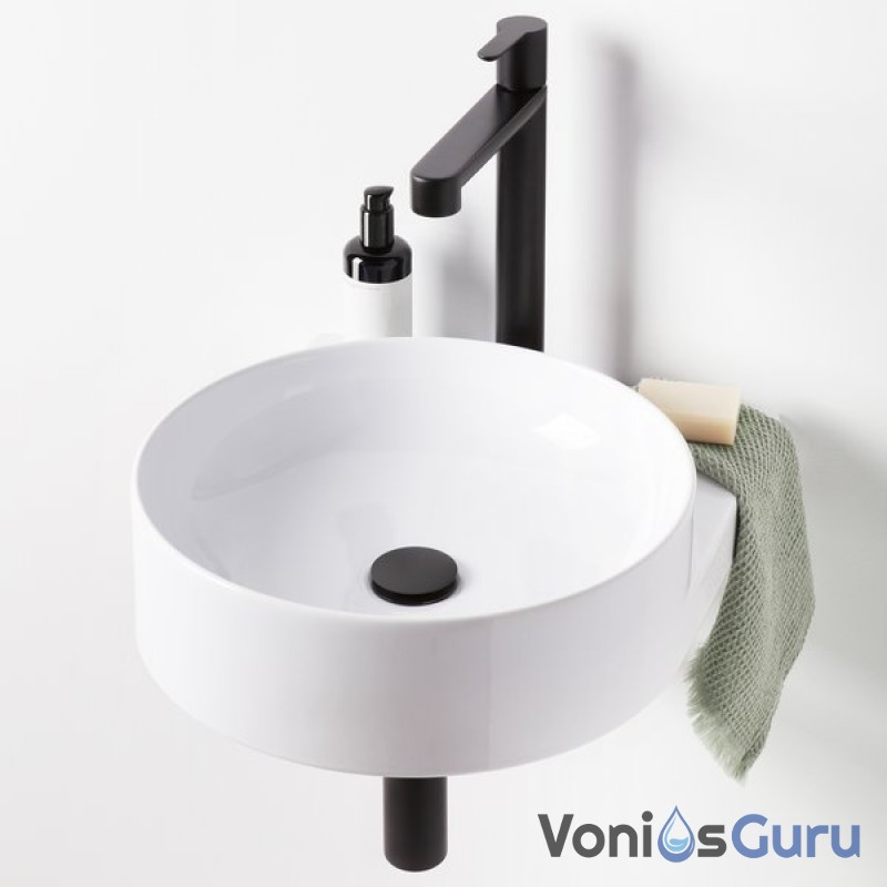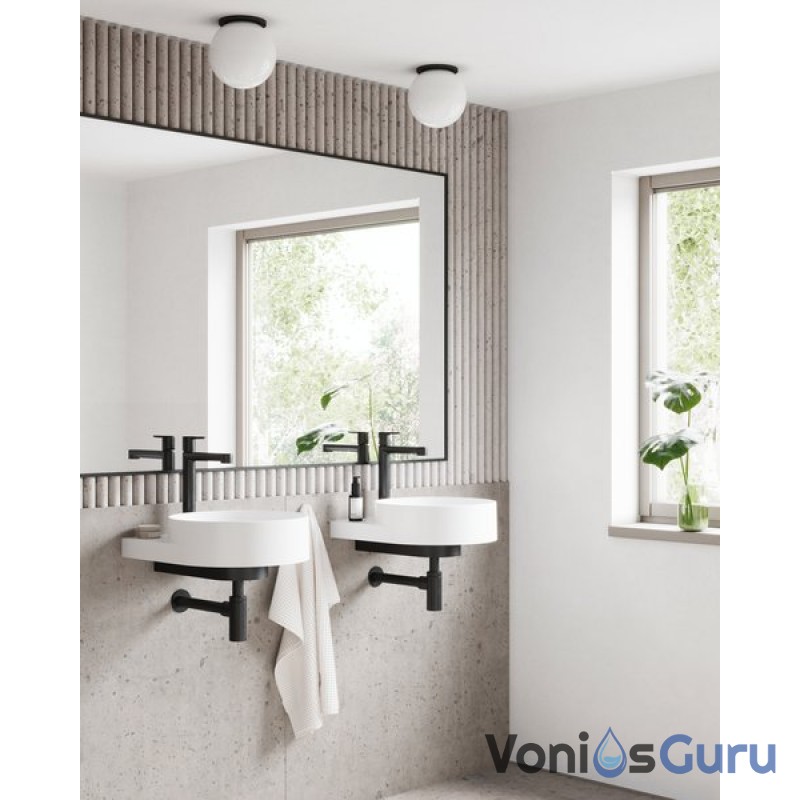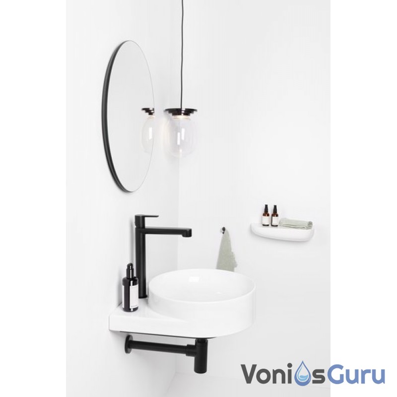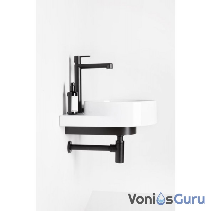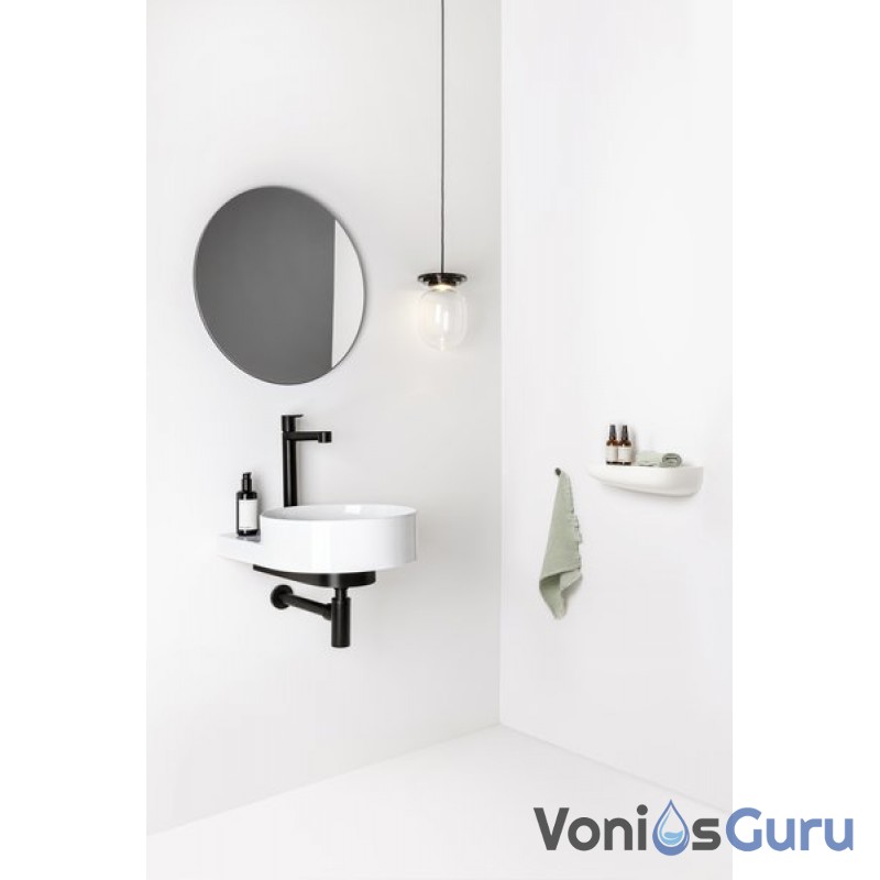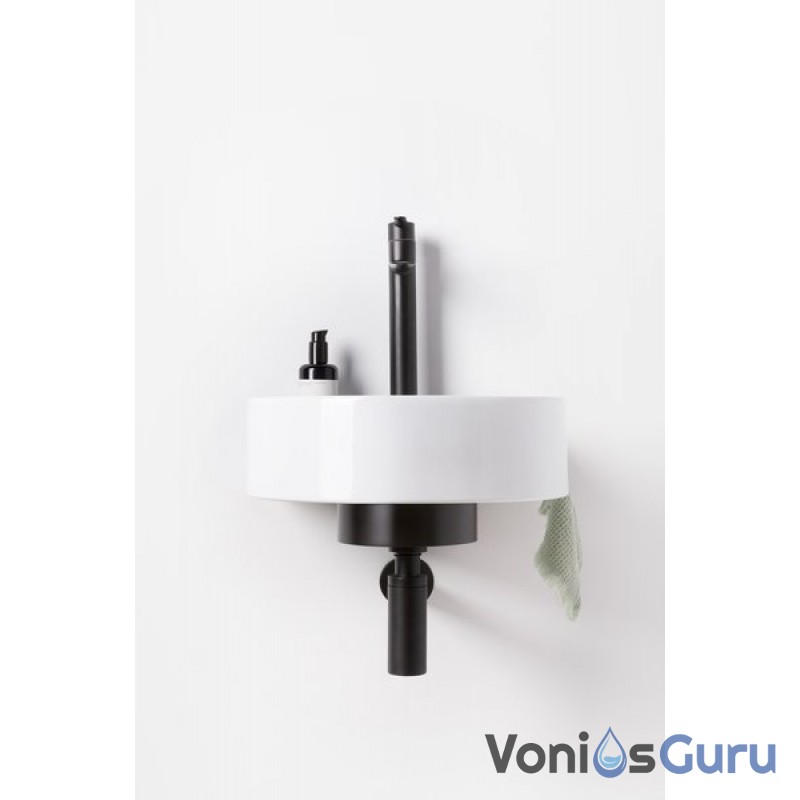 Apvalų sieninį praustuvą papildo dizaino elementas – baltas, juodas arba nerūdijančio plieno laikiklis. Elegancijos magija sujungia laikiklį, maišytuvą, sifoną ir dugno vožtuvą į vientisą derinį.