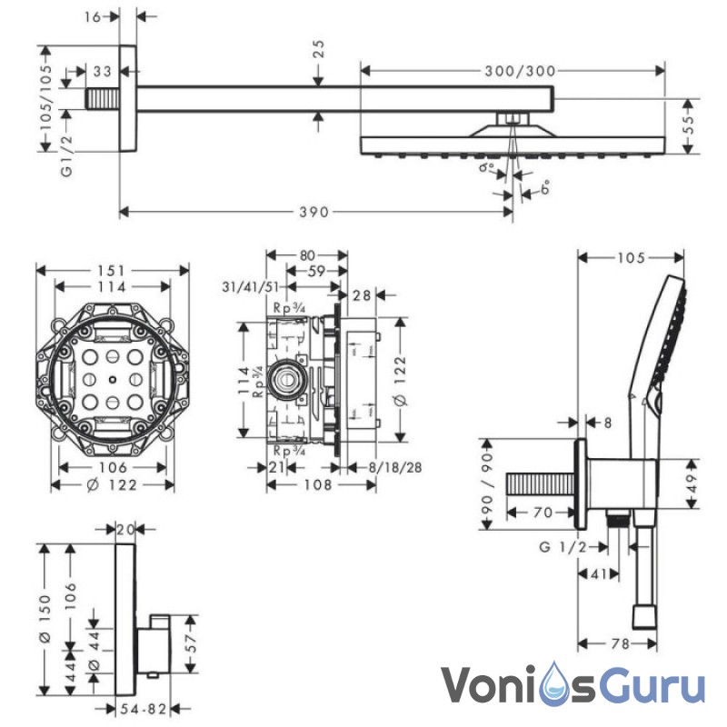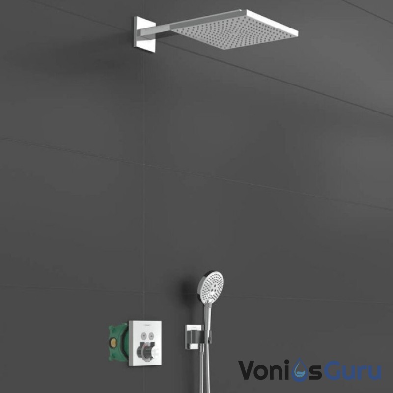 - Raindance E 300 1jet stacionari dušo galva su sieniniu laikikliu (26238000): skersmuo 300 mm, laikiklio ilgis 390 mm, srovės tipai: RainAir (lietutis praturtintas oru), debitas (prie 0,3 MPa) - 17 l/min