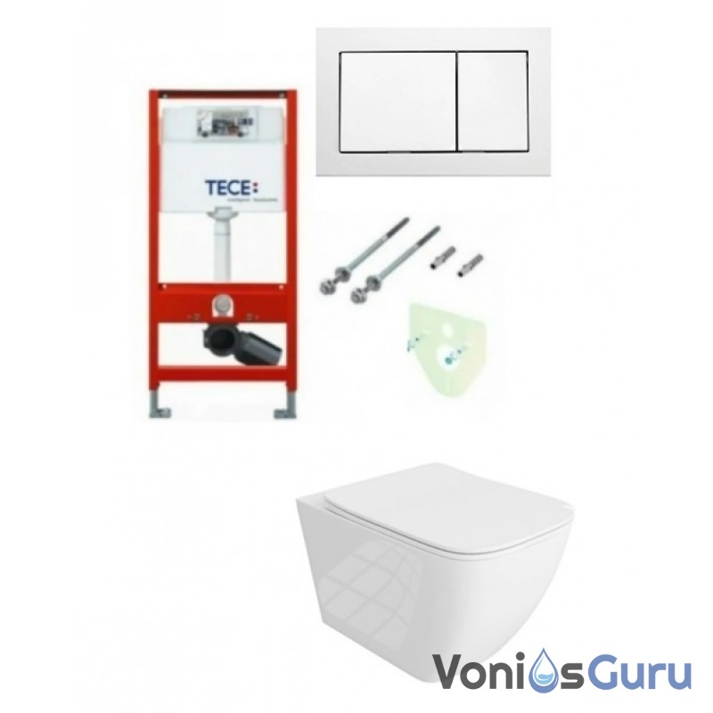 Tece potinkinis rėmas su baltu vandens nuleidimo mygtuku ir Onil rimless pakabinamu klozetu su lėtaeigiu dangčiu